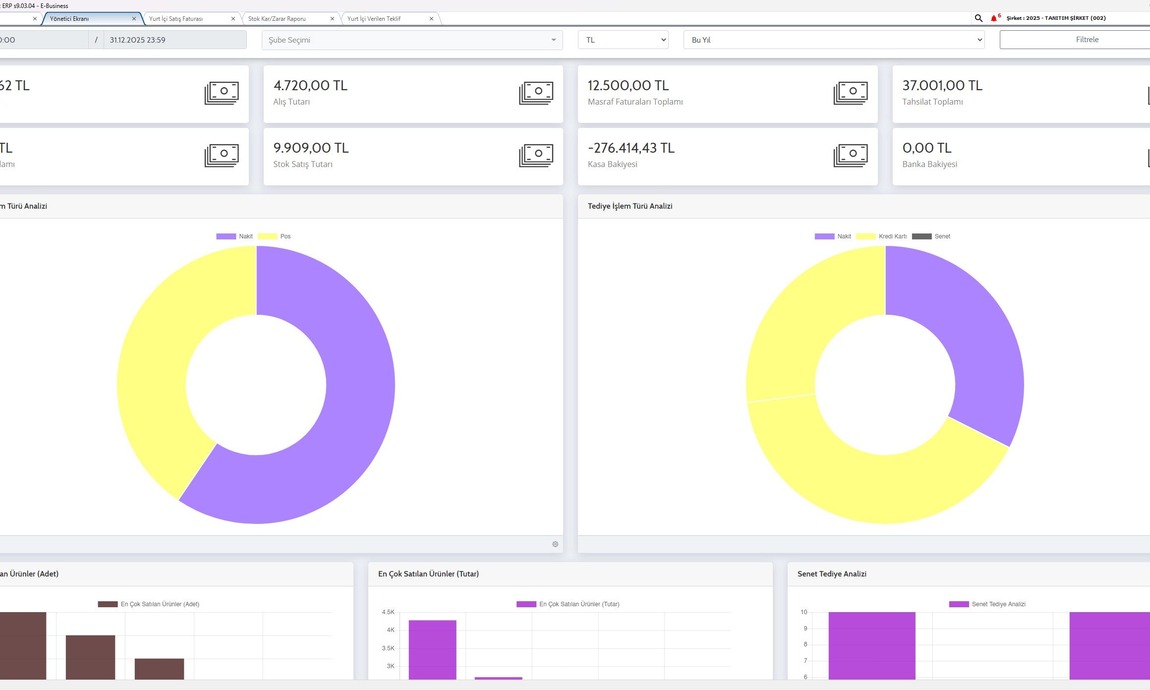 Kurumsal Kaynak Planlaması olan ERP yazılımı ile, Cari, Kasa, Stok, Fatura, Çek-Senet, Teklif, Sipariş, Döviz, Depo ve daha fazlasını titizlikle takip E-Faturalarınızı kesebilir ve yönetebilirsiniz.